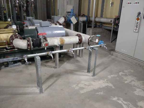 市水本管から上水の供給が停止した場合は、E3のタンクの給水用126m3、給湯用63m3の飲料水を、自家発で時限給水します。また、タンクには配管を接続し、蛇口も付け、手動での取り出しも可能です.給水期間中は、都度、残留塩素濃度計で塩素測定し、給水の安全を確保します。